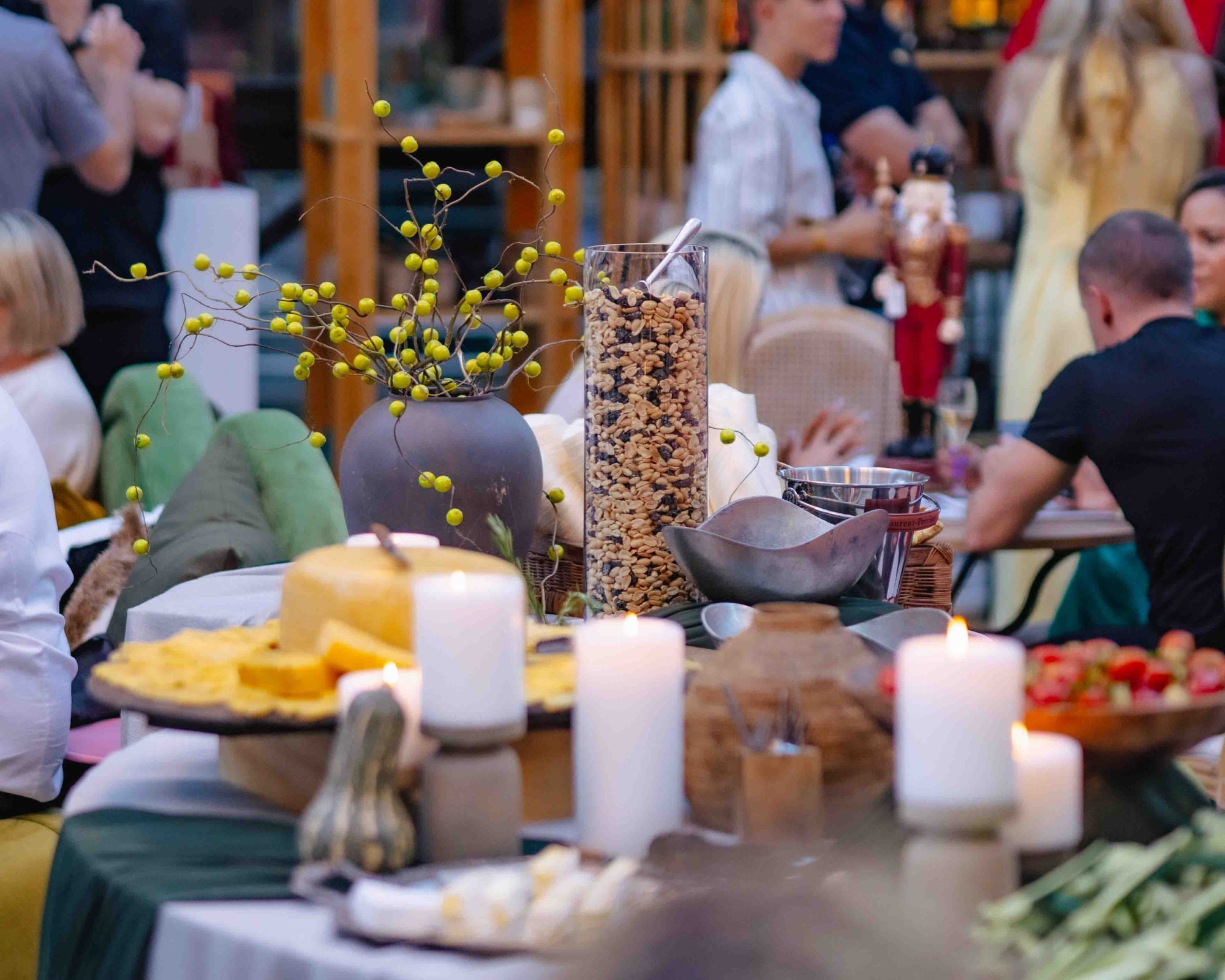 The marquee opens with an impressive archway framed by luxury lifestyle nutcrackers, leading into a space dressed with a statement ceiling installation and elegant décor. Soft Christmas touches anchor comfortable lounge pockets and cocktail tables, creating a relaxed flow for guests who’d like to pause with a drink, snack on their charcuterie selection or simply enjoy the ambience under the Square’s signature sparkling lights. A violinist will perform daily from 6 to 8pm, adding a melodic touch every evening.