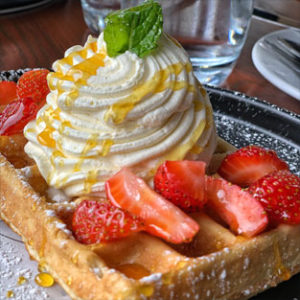 The menu highlights a selection of traditional Belgian cuisine, making it the perfect location for a romantic sunset dinner or a casual family lunch. Starters include saumon marine or mussels à la crème, while hearty mains such as steak au poivre and steaming pots of moules marinières remain favourites. Dessert is a must-have, with many recommending the Waffle à la fraise, a house-made waffle served with strawberries, vanilla ice cream and cream.