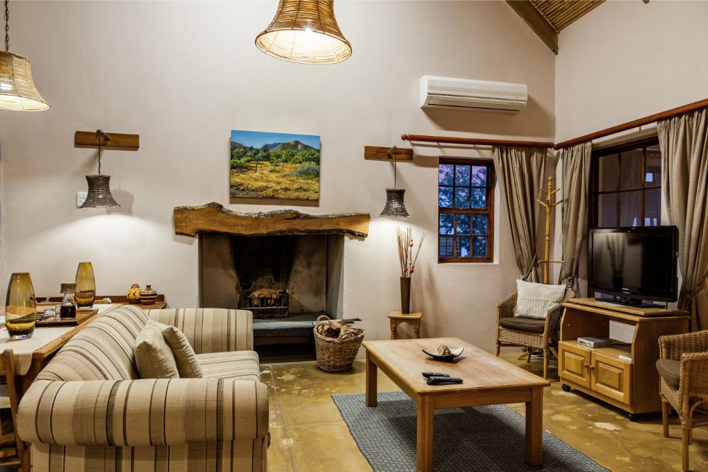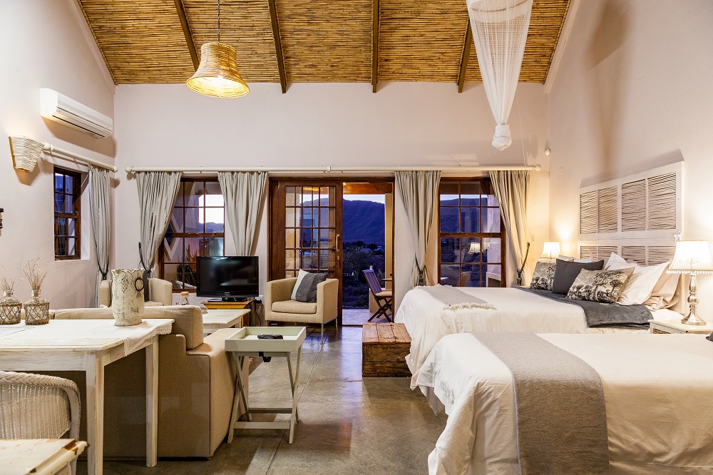Your first choice of accommodation are four open-plan and spacious cottages. You will find these comfortable and beautifully-furnished. All cottages come with large comfy beds, TVs, and have full self-catering kitchens; bathrooms with walk-in showers as well as large windows that offer amazing views of the area and the Swartberg mountains beyond.
