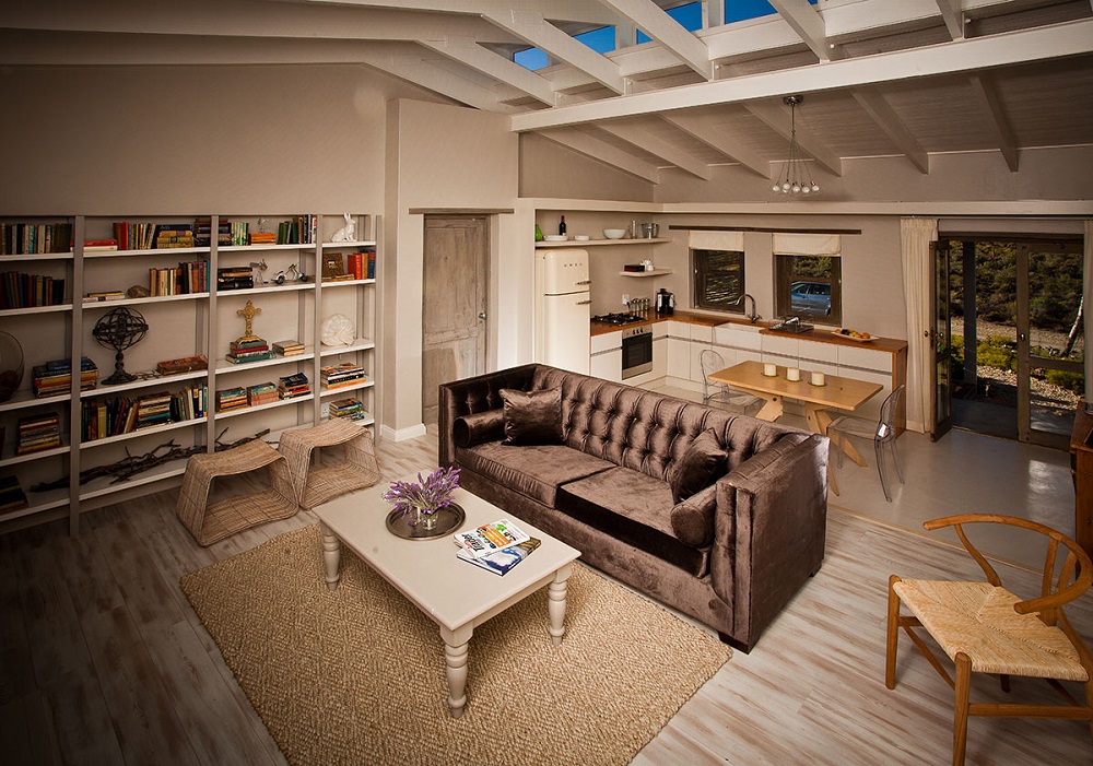 The Library Cottage accommodates four guests, with two sharing each en-suite bedroom. This cottage is a haven for writers and bookworms alike, with a vast bookshelf housing approximately 100 ‘must-read’ books. This cottage exudes serenity, lightness, and sophistication. The shared lounge and dining area provide a choice of comfy or artsy furniture for relaxation.