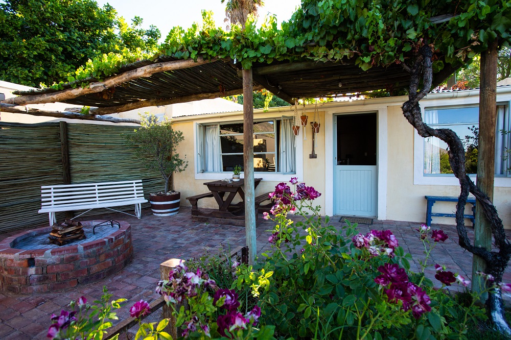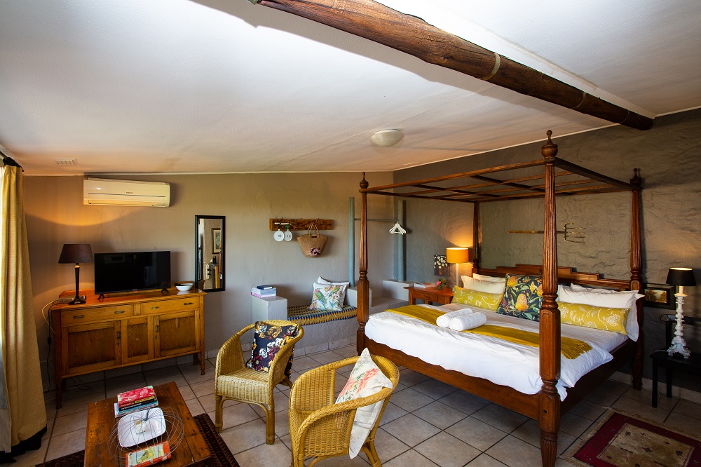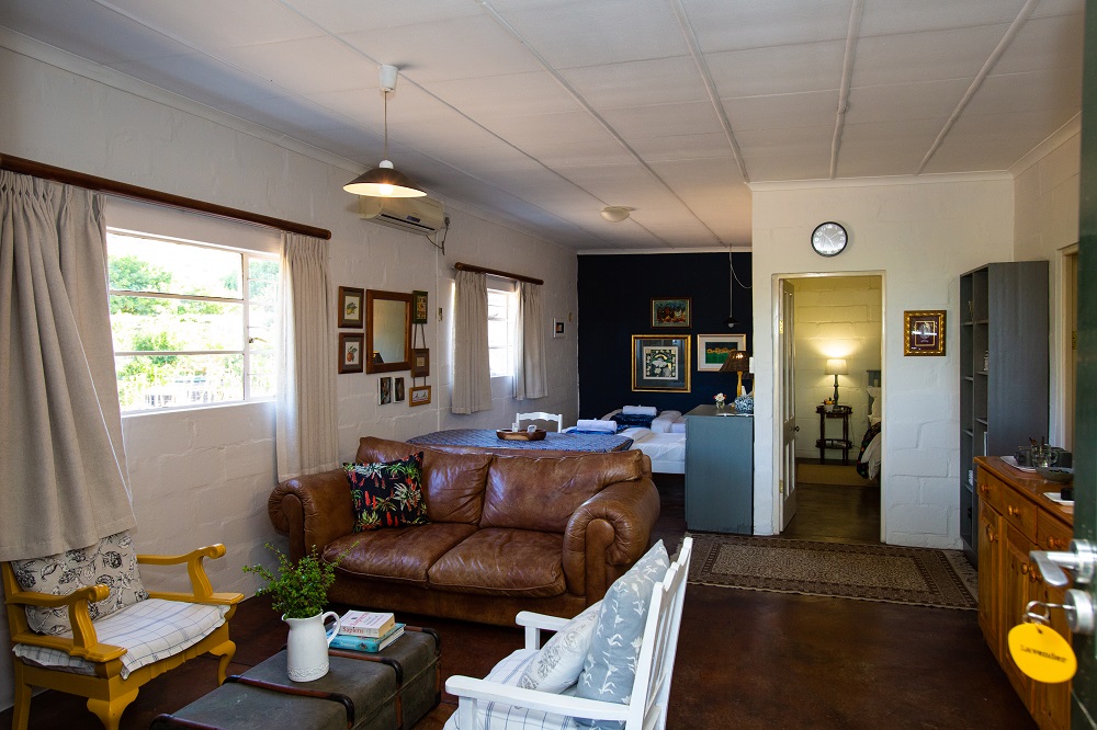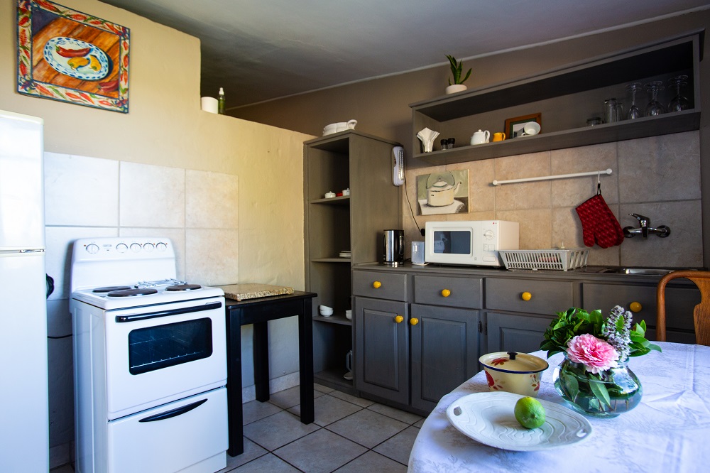 Mustard Cottage has a beautiful four-poster king bed, luxurious bed-linen and electric blankets. The view of the orchard and mountains are unsurpassed, and you are but a few steps from the swimming pool. The patio with pit braai is perfect for clear evenings of star-gazing and the kitchen has everything the weekend chef could ask for. The unit is air-conditioned and guest are spoiled with home -made soap and rusks.