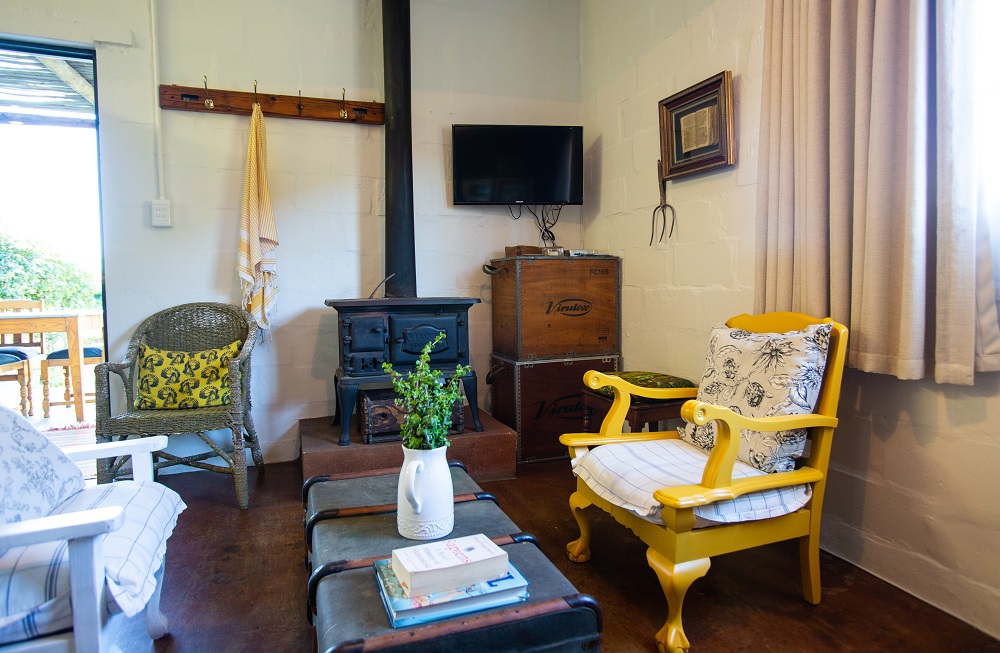Lavender Cottage is completely private and faces the almond orchard. Sleeping up to four guests, it comes with a double bed in the bedroom and two single beds in the lounge area. The flat-screen TV, air-conditioning, top quality bed linen, electric blankets, Nespresso machine and ample stoep with huge braai caters for the whole family. The swimming pool in the orchard is a few steps away. And for cold days and nights, a vintage Dover stove keeps the unit toasty.